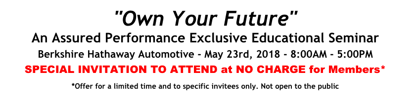 This seminar is by invitation only and will be held: Wednesday, May 23rd, 2018 at Berkshire Hathaway Automotive , from 8AM to 5PM.